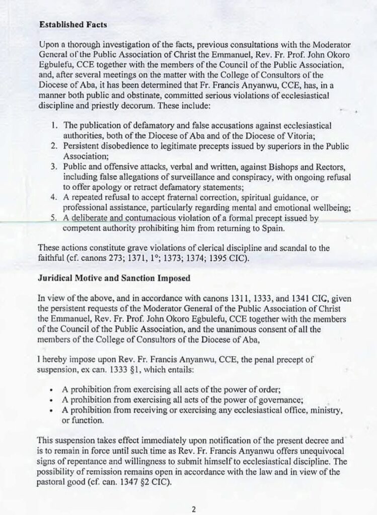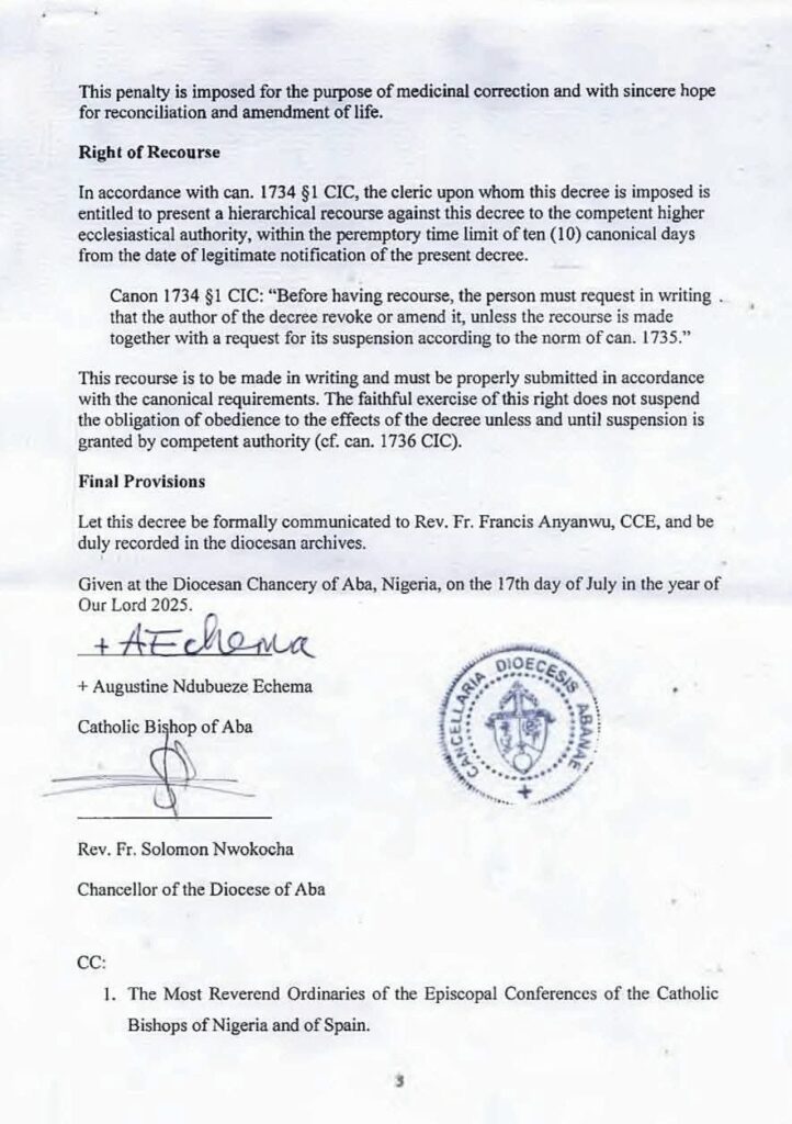 On July 17, 2025, the Catholic Diocese of Aba issued a decree suspending Rev. Fr. Francis Ebere Anyanwu from priestly ministry. The statement, signed by Bishop Augustine Ndubueze Echema, accused Fr. Anyanwu of multiple ecclesiastical violations, ranging from disobedience to defamatory conduct.